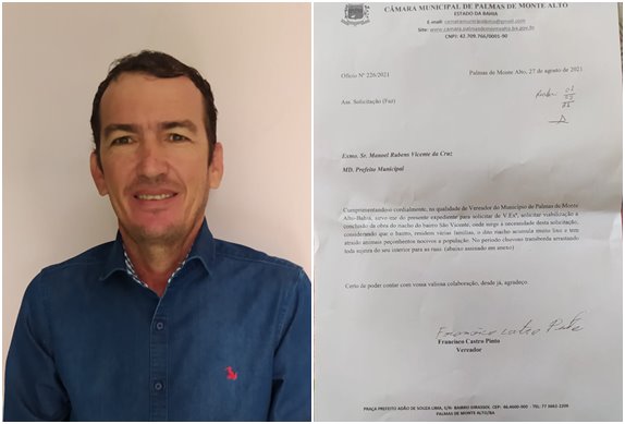 Em ofício encaminhado ao prefeito de Palmas de Monte Alto, o vereador Francisco Castro Pinto (Nem do Alazão) requereu que o Poder Público Municipal promova a conclusão da obra do Riacho do bairro São Vicente, justificando que, no local residem várias famílias, e o referido Riacho acumula muito lixo e tem atraído animais peçonhentos nocivos à população. Inclusive, no período chuvoso transborda toda a sujeira do seu interior para as ruas. O vereador anexou um abaixo-assinado ao ofício que foi lido no plenário da Câmara Municipal.