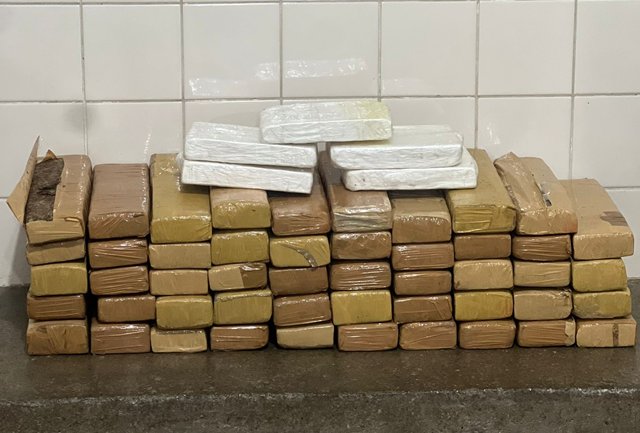 Durante a fiscalização no compartimento de bagagens, os policiais localizaram duas malas que exalavam forte odor característico de maconha. Ao abrirem os volumes, foram encontrados 49 tabletes de substância análoga à maconha e cinco tabletes de substância semelhante à pasta base de cocaína.