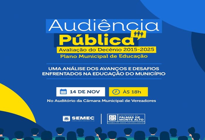 Na próxima sexta-feira (14), às 18h, será realizada a Audiência Pública de Avaliação do Decênio 2015–2025 do Plano Municipal de Educação (PME), no auditório da Câmara de Vereadores de Palmas de Monte Alto (BA).