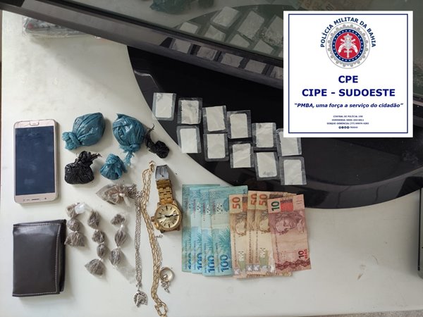 De acordo com informações repassadas pela polícia ao PORTAL VILSON NUNES, por volta das 11h30, a guarnição da CAESG realizava rondas na cidade, quando avistou o referido indivíduo em atitude suspeita conduzindo um veículo. Na ocasião, os policiais fizeram a abordagem, quando foram encontrados 11 (onze) porções de substância análoga a Cocaína; 11 (onze) porções de substância análoga a maconha; 04 (quatro) tabletes de substância análoga a maconha prensada; 01(um) aparelho celular marca Samsung Galaxy J7; R$ 560,00 (Quinhentos e sessenta reais) em espécie; 01 (uma) corrente de ouro; 01 (uma) corrente de prata; 01 (um) Relógio de pulso foleado a ouro; e 01 (um) Anel foleado a ouro.