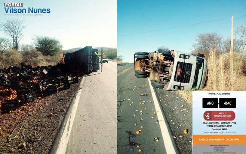 Um caminhão, modelo VW/24.250 CLC 6 x2, ano 2011, cor prata, carregado com frutas, de placa ANO-4640, licenciado em Ferraz de Vasconcelos (SP), capotou na BR-122, no trecho próximo à fazenda Mata Viado, em Urandi (BA). O acidente aconteceu na madrugada desta sexta-feira (28). Não há informações sobre as causas, mas a principal suspeita da polícia é de que o condutor cochilou ao volante e perdeu o controle da direção. O motorista sofreu ferimentos leves. O que chamou à atenção foi o fato de que após consulta no Sinesp, constatou-se que o veículo envolvido no acidente tem restrição de furto/roubo.