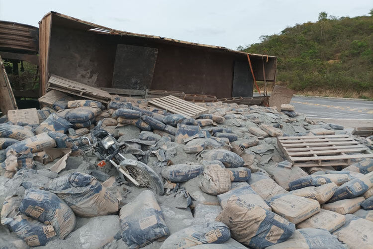 Um caminhão carregado com cimento tombou nesta quarta-feira (09), no entroncamento da BA-156 com a BA-026, na cidade de Licínio de Almeida, a 148 km de Brumado, nesta quarta-feira (09).