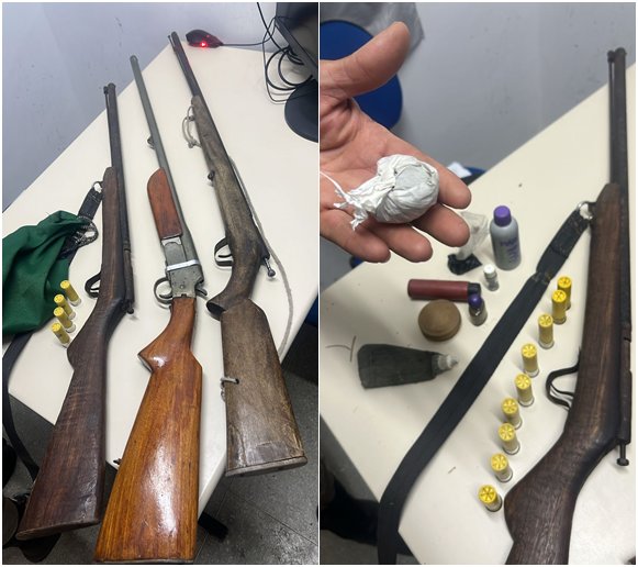 Conforme a polícia, na residência do suspeito foram localizadas e apreendidas armas de fogo, sendo três espingardas, duas delas de calibre 20 e uma calibre 28, todas com numeração suprimida, dois potes de pólvora, dois potes de chumbo, uma caixa com espoletas, seis cartuchos calibre 20 e cerca de 20 gramas de maconha.