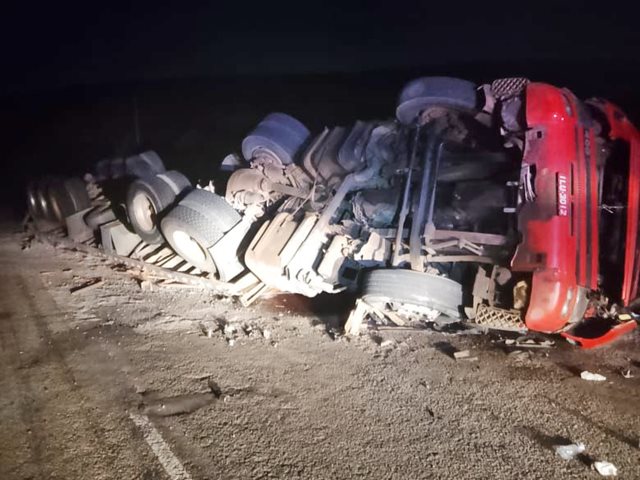 Uma carreta carregada com postes de concreto tombou na madrugada desta quarta-feira (8), por volta de 1h35, no entroncamento da BA-156 com a BA-026, no município de Licínio de Almeida (BA).