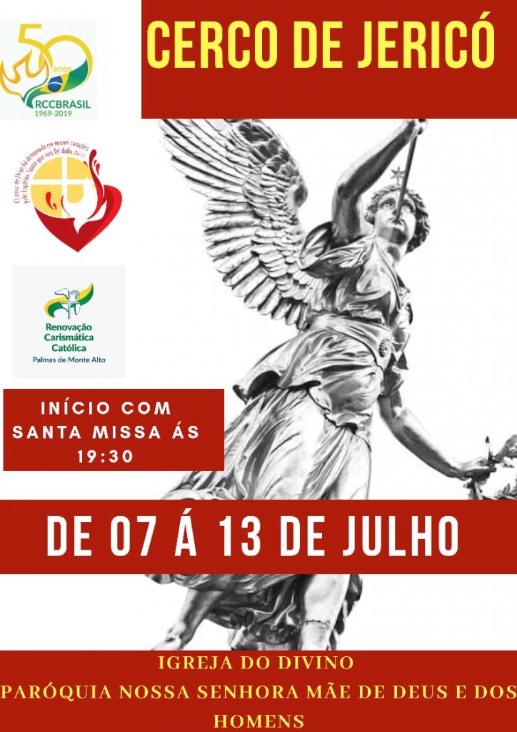 A Paróquia Nossa Senhora Mãe de Deus e dos Homens de Palmas de Monte Alto-BA, realizará nos dias 07 a 13 de julho de 2019, o Cerco de Jericó, na responsabilidade do Grupo de Oração Emanuel da Renovação Carismática Católica.