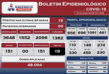 A Secretaria Municipal de Saúde de Palmas de Monte Alto, divulgou na tarde desta segunda-feira (4) novo boletim da Covid-19. Conforme o relatório, nas últimas 24 horas houve o registro de mais 19 casos, totalizando 151 casos ativos. Não há nenhum paciente internado. Desde o início da pandemia já foram registrados 1.552 casos no município, sendo que destes 1.382 foram curados. 19 pessoas já morreram em decorrência da doença.
