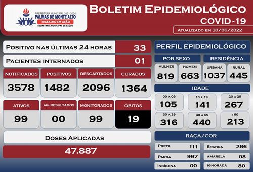 A Secretaria Municipal de Saúde de Palmas de Monte Alto, divulgou nesta quinta-feira (30) novo boletim da Covid-19. Conforme o relatório, nas últimas 24 horas houve o registro de mais 33 novos casos, totalizando 99 casos ativos. Agora, uma pessoa está internada no Hospital Municipal, sendo um idoso de 70 anos. Desde o início da pandemia já foram registrados 1.482 casos no município, sendo que destes 1.364 foram curados. 19 pessoas já morreram em decorrência da doença.