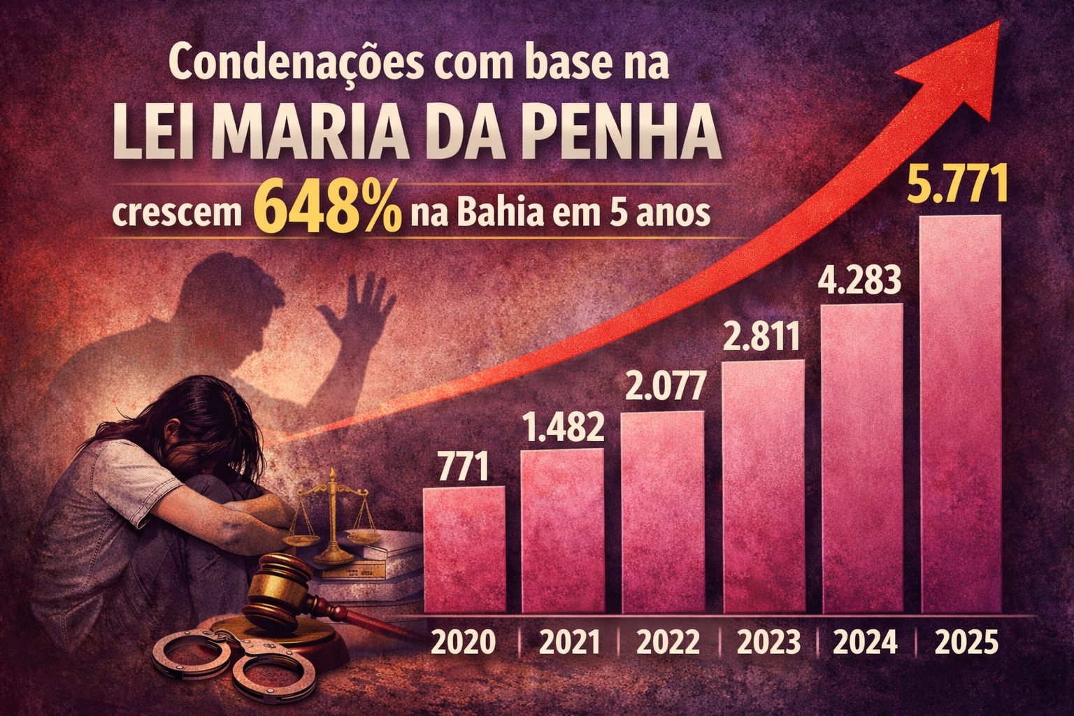 O número de condenações em primeiro grau com base na Lei Maria da Penha aumentou 648,5% nos últimos cinco anos na Bahia, segundo dados do Tribunal de Justiça da Bahia (TJ-BA) divulgados pela TV Bahia. Em 2020, foram registradas 771 condenações, número que saltou para 5.771 em 2025.