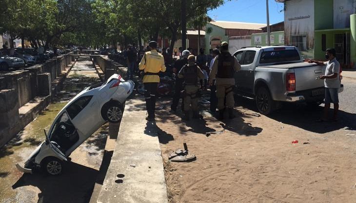 Um veículo, modelo Toyota/Corolla, ano 2018, cor branca, placa PKM-6956, licença de Guanambi (BA), caiu no canal da feira, na manhã desta terça-feira (23), após ser atingido por uma caminhonete S10, cor prata, placa OVB-0767, licença de Guanambi (BA), nas proximidades da Madeireira Ribeiro, na avenida Senador Nilo Coelho, no centro de Guanambi (BA).