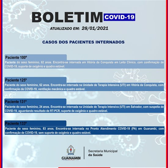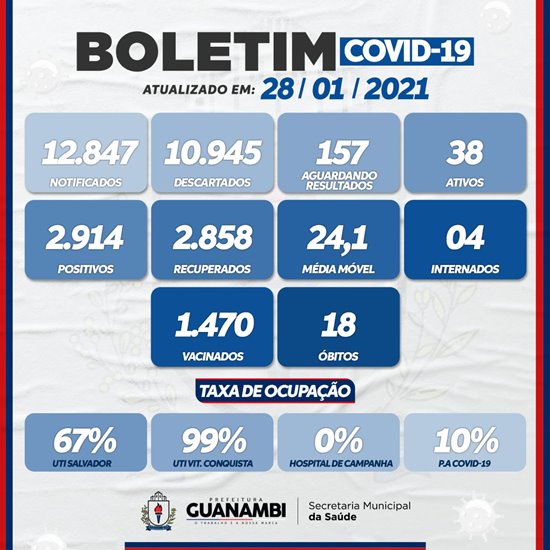 Mais 13 casos de coronavírus foram confirmados em Guanambi, nas últimas 24h, conforme boletim epidemiológico divulgado pela Secretaria Municipal de Saúde, na noite desta quinta-feira (28). Com esses novos registros, o município atingiu 2817 casos de infecção da doença, sendo que 2767 pacientes são considerados recuperados.