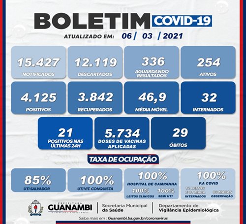 Neste sábado (6), mais 21 casos da Covid-19 foram registrados em Guanambi, conforme consta no boletim epidemiológico, divulgado pela Secretaria Municipal de Saúde.