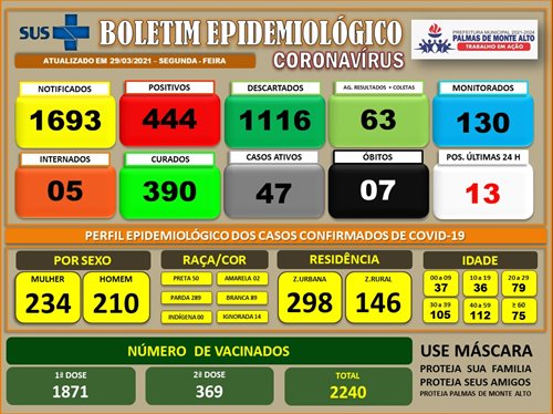 Na tarde desta segunda-feira (29), mais 13 casos do novo coronavírus (covid-19) foram registrados no município de Palmas de Monte Alto, conforme apontou o boletim epidemiológico, divulgado pela Secretaria Municipal de Saúde. Com esses novos registros, o município atingiu 444 infecções da doença. O número de recuperados é de 390 e 47 pacientes estão em tratamento. Até o momento, o município contabiliza 7 óbitos em decorrência da doença.