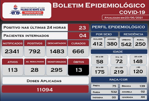 Na tarde desta quarta-feira (23), mais 23 casos do novo coronavírus (covid-19) foram registrados no município de Palmas de Monte Alto, conforme apontou o boletim epidemiológico, divulgado pela Secretaria Municipal de Saúde. Com esses novos registros, o município atingiu 792 infecções da doença. O número de recuperados é de 666 e 113 pacientes estão em tratamento. Até o momento, o município contabiliza 13 óbitos em decorrência da doença. O último foi registrado hoje. A vítima trata-se de uma mulher de 71 anos.