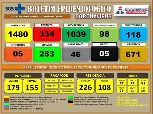 Na tarde desta segunda-feira (8), mais 11 casos do novo coronavírus (covid-19) foram registrados no município de Palmas de Monte Alto, conforme apontou o boletim epidemiológico, divulgado pela Secretaria Municipal de Saúde. Com esses novos registros, o município atingiu 334 infecções da doença. O número de recuperados é de 283 e 46 pacientes estão em tratamento. Até o momento, o município contabiliza 5 óbitos em decorrência da doença.