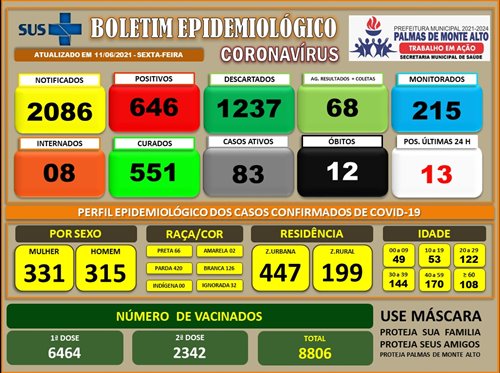 Na tarde desta sexta-feira (11), mais 13 casos do novo coronavírus (covid-19) foram registrados no município de Palmas de Monte Alto, conforme apontou o boletim epidemiológico, divulgado pela Secretaria Municipal de Saúde. Com esses novos registros, o município atingiu 646 infecções da doença. O número de recuperados é de 551 e 83 pacientes estão em tratamento. Até o momento, o município contabiliza 12 óbitos em decorrência da doença.