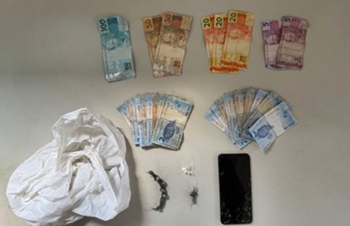 Durante a ação, os policiais encontraram sete porções de substância semelhante à cocaína, R$ 314 em dinheiro fracionado e um aparelho celular.