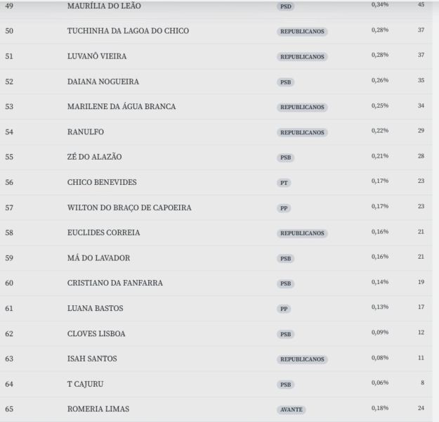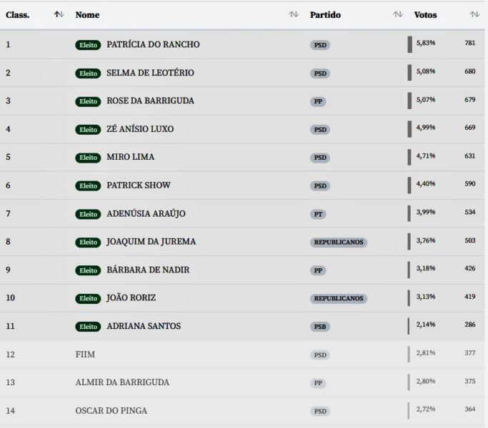 Os vereadores que conseguiram se reeleger são: Patrícia do Rancho (PSD), Selma de Leotério (PSD), Rose da Barriguda (PP), Adenúsia Araújo (PT), Joaquim da Jurema (Republicanos) e Bárbara de Nadir (PP). Já os que não renovaram os mandatos são: Almir da Barriguda (PP) e Oscar do Pinga (PSD). Os novos são: Zé Anísio Luxo (PSD), Miro Lima (PSD), Patrick Show (PSD), João Roriz (Republicanos) e Adriana Santos (PSB).