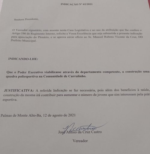 O vereador José Anísio da Cruz Castro (Zé Anísio) conseguiu aprovação da Câmara Municipal para a sua indicação nº62/2021, onde ele pede ao Poder Público Municipal, que seja construída uma quadra poliesportiva na comunidade de Curralinho, na zona rural de Palmas de Monte Alto (BA). O documento foi encaminhado ao prefeito Manoel Rubens.