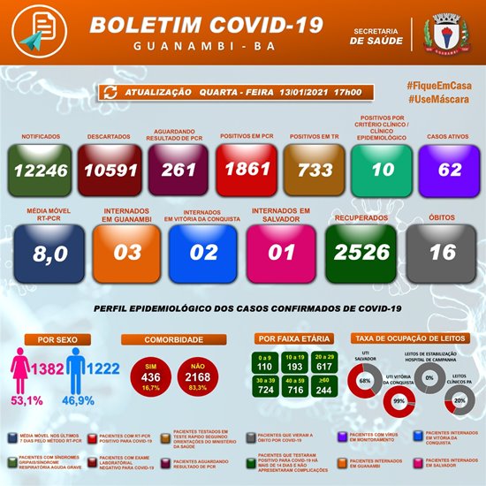 Mais 13 casos de coronavírus foram confirmados em Guanambi, nas últimas 24h, conforme boletim epidemiológico divulgado pela Secretaria Municipal de Saúde, na tarde desta quarta-feira (13). Segundo os dados, 12 pacientes foram testados por meio de teste rápido e mais 1 via PCR. Com esses novos registros, o município atingiu 2604 casos de infecção da doença, sendo que 2526 pacientes são considerados recuperados.