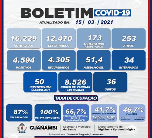Nesta segunda-feira (15), foi confirmado o 36º óbito por complicações da Covid-19 no município de Guanambi. A vítima trata-se de uma mulher de 81 anos, portadora de comorbidade (Hipertensão Arterial Sistêmica), admitida no dia 22 de fevereiro no Pronto Atendimento Covid em Guanambi, com confirmação de Covid. No dia 27 de fevereiro, a paciente foi transferida para o Hospital de Campanha e devido ao estado grave fez uso de ventilação mecânica e aguardava regulação para Unidade de Terapia Intensiva em um Hospital de Referência. No dia 13 de março foi transferida para o Hospital Geral de Guanambi. Com piora no quadro clínico evoluiu para óbito nesta unidade de saúde na manhã desta segunda-feira (15).