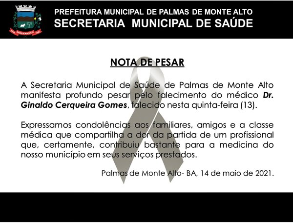 A Secretaria Municipal de Saúde de Palmas de Monte Alto emitiu Nota de Pesar se solidarizando com a família. Segundo o Secretário de Saúde – Marcos Túlio (Tito), Dr. Ginaldo exerceu a profissão na sede do município por muitos anos quando ainda não tinha o hospital e também já atuou no Posto de Saúde da localidade de Casa Velha, na zona rural do município. [veja a Nota]