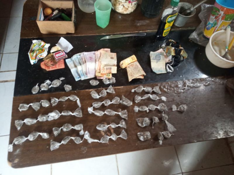 Diante das informações, guarnições da CETO, da 1ª Cia e do Coordenador de Área compareceram ao local, e lá chegando encontraram o adolescente I. R. S., 17 anos. Na abordagem, foram encontradas em poder dele, 63 pedras de crack, 62 buchas de maconha e 1 porção de maconha pesando 156g, além de um aparelho celular marca Samsung J2, a quantia de R$ 791, e diversas embalagens usadas para acondicionar drogas.