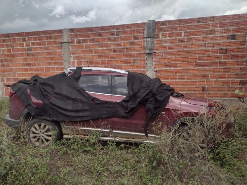 Ao chegar ao local, a Guarnição encontrou o veículo Fiat Toro Rancho, cor vermelha, Placa QTU 8D87, licença de Itabuna-BA, coberto por um pano e com a cobertura vegetal do terreno.