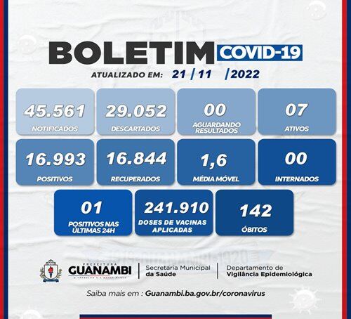 Desde o início da pandemia até agora foram registrados 142 mortes por complicações da Covid-19, sendo 45.561 notificados. Guanambi já aplicou  241.910 doses da vacina contra a Covid-19.