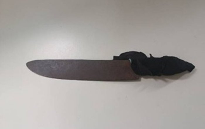 Durante as diligências, os policiais localizaram o suspeito na Rua Adolfo Amorim, ainda portando a arma branca. O homem foi contido e desarmado pela guarnição.