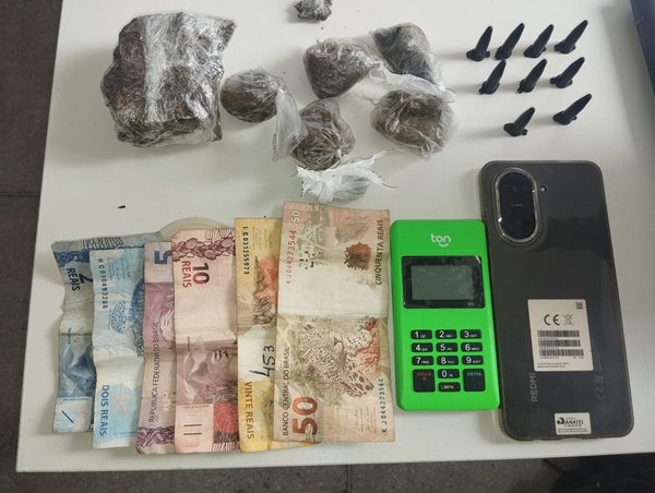 Durante a abordagem, foram encontrados com o jovem uma porção grande de maconha, além de outras sete porções menores da mesma substância, nove pinos contendo material semelhante à cocaína, um aparelho celular e a quantia de R$ 89 em dinheiro. Todo o material foi apreendido no local.