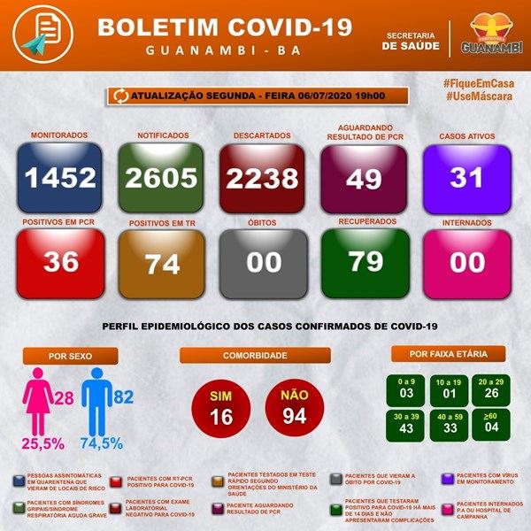 Dos 110 casos confirmados, nenhum apresenta sintomas graves da doença, e 16 pacientes já apresentavam comorbidades, todos estão sendo acompanhados. Entre os diagnósticos: 31 pacientes em tratamento e 79 recuperados. No momento, 49 ainda aguardam resultado laboratorial e 2238 já foram descartados. [confira o boletim]