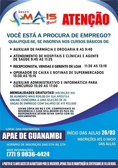Reconhecida com uma das empresas que mais coloca alunos no mercado de trabalho a MAIS BRASIL traz diversos cursos de capacitação profissional para Guanambi, na APAE, com aulas somente aos sábados, os interessados não pagarão mensalidade.