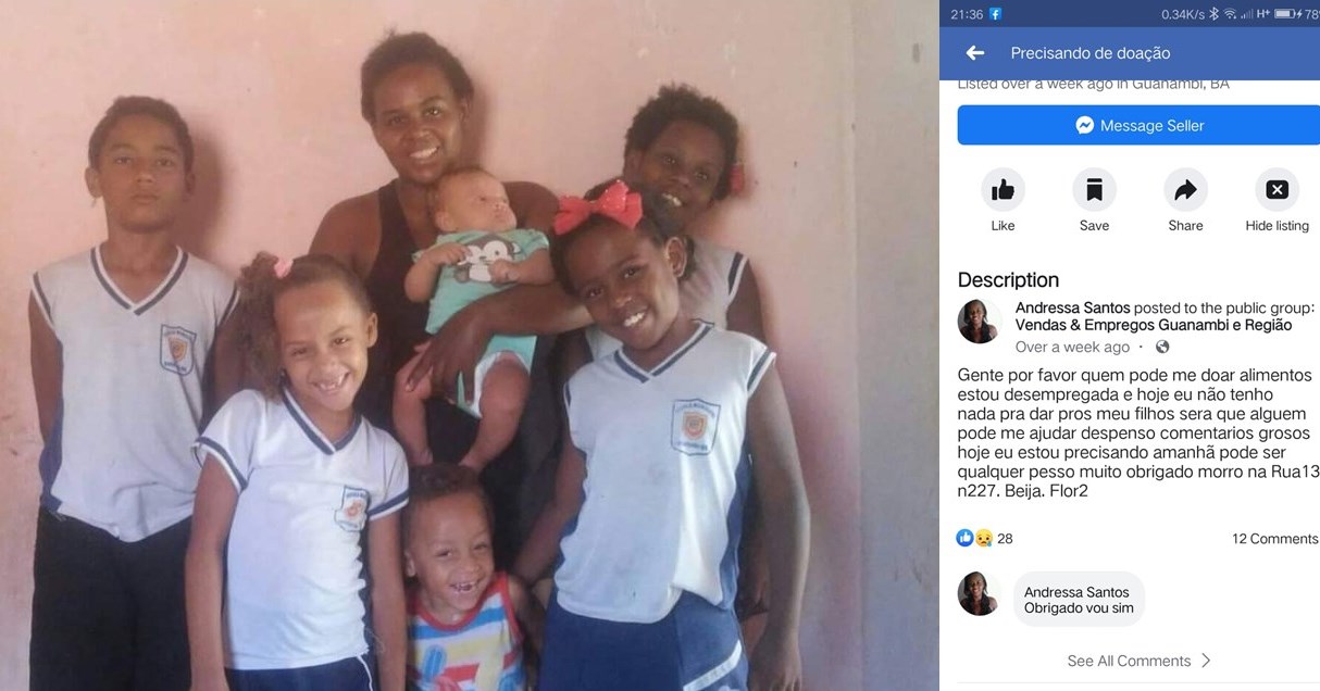 Uma moradora do Bairro Beija Flor, em Guanambi (BA), fez um apelo no Facebook, solicitando alimentos por estar desempregada atualmente e, não ter nada em sua casa para dar a seus filhos.