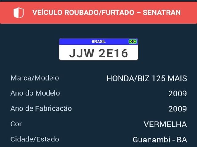 Uma motocicleta Honda Biz 125, de cor vermelha e placa JJW2E16, foi furtada na manhã desta quarta-feira (15) na Travessa Sete de Setembro, próximo ao Lojão Central, no centro de Guanambi (BA).