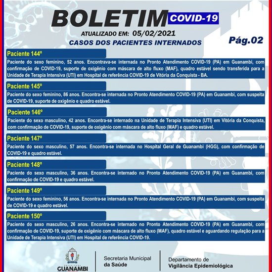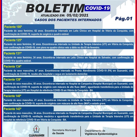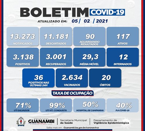 Nesta sexta-feira (5), mais 36 casos da Covid-19 foram registrados em Guanambi, conforme consta no boletim epidemiológico, divulgado pela Secretaria Municipal de Saúde.