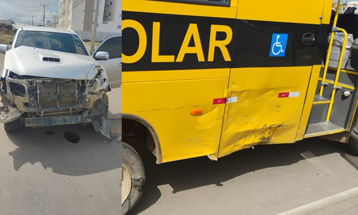 Um ônibus escolar e uma caminhonete Toyota Hilux se envolveram em uma colisão na manhã desta quinta-feira (27), por volta das 7h50, nas proximidades do Ginásio de Esportes de Guanambi. O acidente ocorreu no cruzamento da Avenida Valmir Francisco de Moraes com a Rua Atílio Pereira de Oliveira, no bairro Sandoval Moraes.