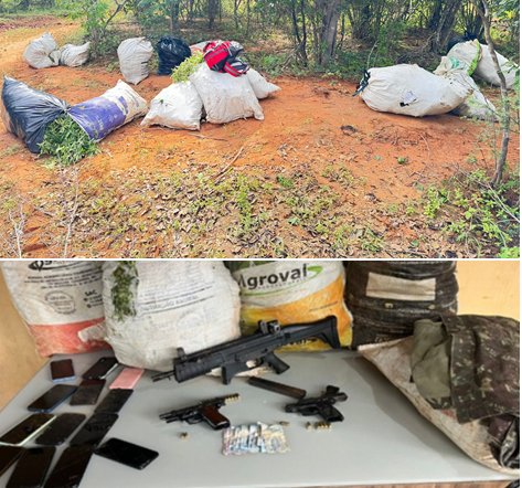 Foram apreendidas pistolas, submetralhadora, munições, 14 sacos grandes de maconha, uma gandola camuflada, além de 11 smartphones e oito veículos utilizados na ação.