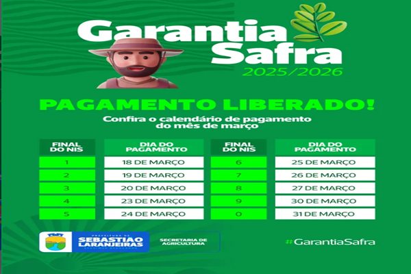 O pagamento do benefício do Garantia Safra 2025/2026 já foi liberado para agricultores do município de Sebastião Laranjeiras (BA).