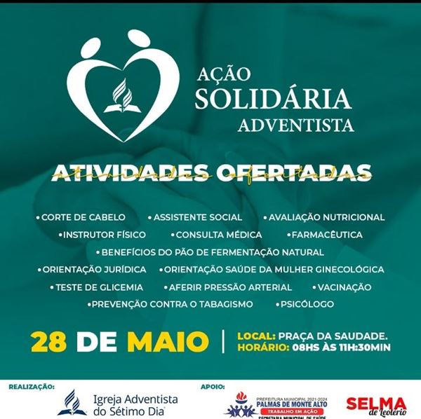 Por este amor fraterno que ensina o Senhor a praticarmos, a Igreja Adventista do Sétimo Dia de Palmas de Monte Alto vem pelo amor em ti servir, convidar a toda população montealtense a participar da primeira Feira de Saúde e Ação Social, a realizar-se no dia 28/05 do corrente ano, das 08 horas às 11:30 min, na praça da Saudade, na qual estaremos oferecendo como atividade gratuitas:
