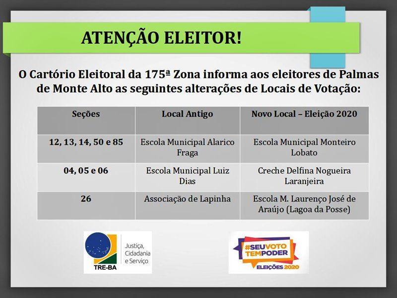 Segundo o servidor da justiça, no município de Palmas de Monte Alto algumas seções foram distribuídas e os referidos eleitores votarão em outros locais, conforme a tabela abaixo. [veja]