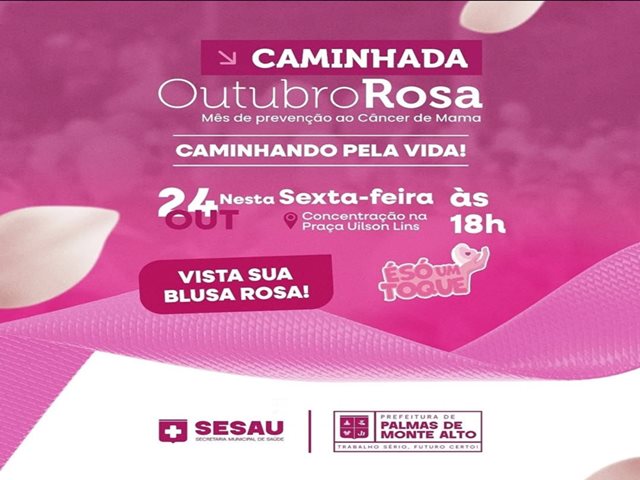 A Secretaria Municipal de Saúde de Palmas de Monte Alto (BA) promove nesta sexta-feira (24) a tradicional Caminhada do Outubro Rosa, evento que integra a programação de conscientização sobre o combate ao câncer de mama e de colo do útero.