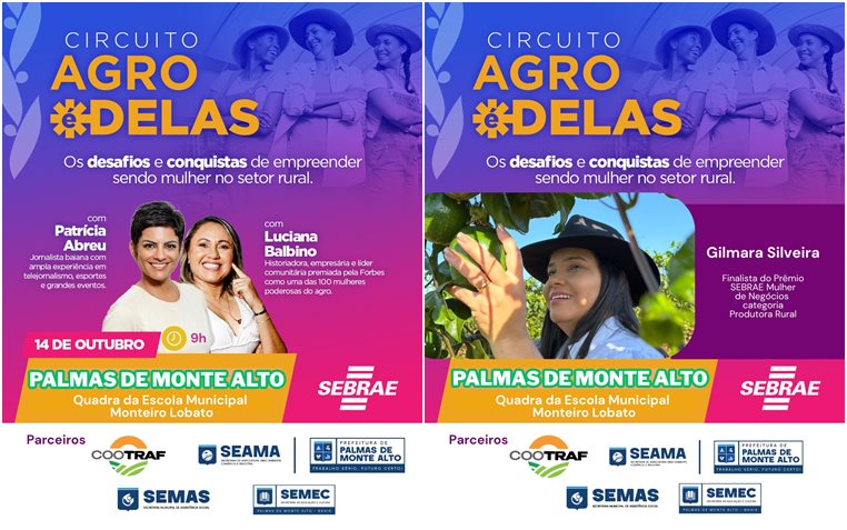O município de Palmas de Monte Alto (BA) será palco de mais uma edição do Circuito Agro é Delas, promovido pelo Sebrae, no próximo dia 14 de outubro, a partir das 9h, na Quadra da Escola Municipal Monteiro Lobato. O evento traz como tema central “Os desafios e conquistas de empreender sendo mulher no setor rural” e busca inspirar, capacitar e fortalecer o papel das mulheres no agronegócio.