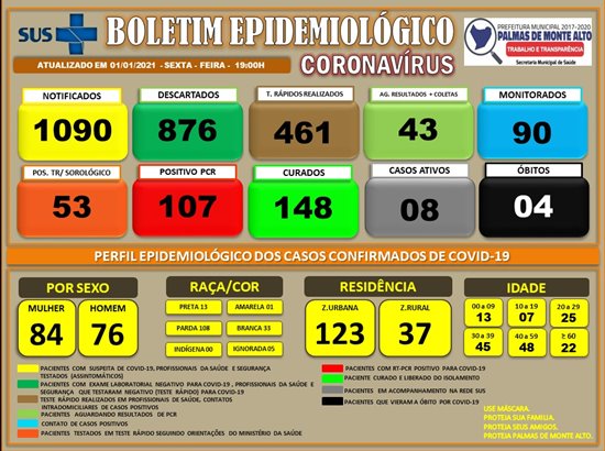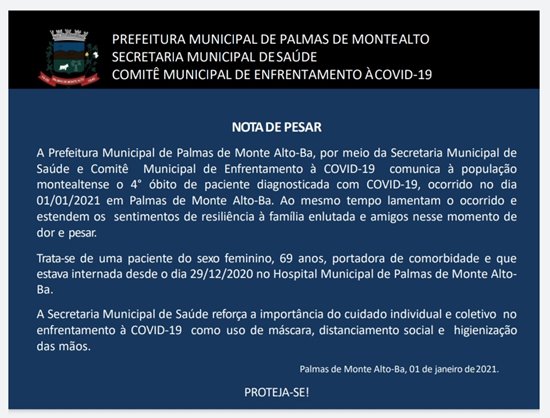 Uma mulher de 69 anos, que estava internada desde o dia 29 de dezembro de 2020, no Hospital Municipal Milton Farias Dias Laranjeira, é o 4º óbito relacionado à Covid-19 na cidade de Palmas de Monte Alto (BA). Conforme informações repassadas ao PORTAL VILSON NUNES, o falecimento aconteceu na madrugada desta sexta-feira (1). A idosa era portadora de comorbidades, residente no centro da cidade. Em nota, a Secretaria Municipal de Saúde lamentou o ocorrido e reforçou a importância da prevenção à doença. [veja]
