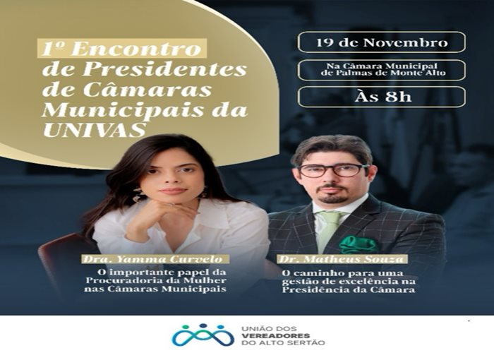 A União dos Vereadores do Alto Sertão da Bahia (UNIVAS) promoverá, no próximo dia 19 de novembro, o 1º Encontro de Presidentes de Câmaras Municipais do Alto Sertão Baiano, reunindo lideranças legislativas de toda a região. O evento será realizado a partir das 8h, no plenário da Câmara Municipal de Palmas de Monte Alto.