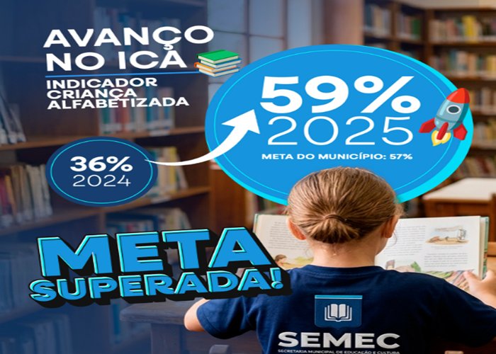 O avanço ocorre em meio às ações voltadas à alfabetização desenvolvidas pela rede municipal de ensino, incluindo formação continuada de professores, acompanhamento pedagógico e estratégias voltadas ao fortalecimento da aprendizagem nos anos iniciais.