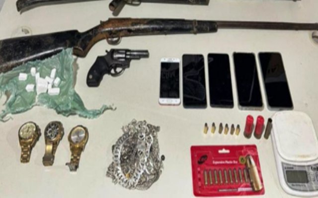 Durante as buscas no interior do imóvel, foram apreendidos aproximadamente 40 gramas de cocaína, um revólver calibre .38, duas espingardas de fabricação caseira calibre 12, dezesseis munições calibre .32, duas munições calibre 12, uma munição deflagrada calibre 36, uma balança de precisão, cinco aparelhos celulares, três relógios de pulso, quatro correntes prateadas e três pulseiras prateadas.