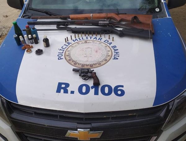 Na manhã desta terça-feira (24), por volta das 10h, após receber a informação da Polícia Civil que um homem de 61 anos constantemente agredia fisicamente a companheira de 56 anos, descumprindo medida protetiva de urgência decretada pela Justiça, ofendia, ameaçava e retia o cartão bancário da própria mãe de 90 anos e ainda possuía armas de fogo, a guarnição do 1° Pelotão da 3ª Companhia do 17° Batalhão de Polícia Militar compareceu ao povoado da Barrinha, zona rural de Carinhanha, encontrando os envolvidos. Ao ser indagado, o suspeito assumiu os crimes, indicou a localização das armas e autorizou o acesso à residência. Dentro de um quarto trancado, os policiais militares acharam, escondidos embaixo de um lençol que estava sobre uma cama, os seguintes objetos: