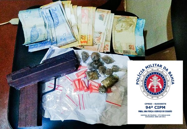 Na abordagem foi encontrado, sob sua posse, um simulacro de arma de fogo, 12 pinos de cocaína, 10 trouxas de maconha e recuperados R$ 800,00 (oitocentos reais) fruto do roubo.