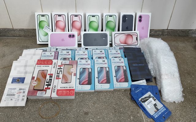 Durante a fiscalização no compartimento de cargas, os agentes localizaram um volume contendo 10 celulares iPhone, 15 telas, 12 baterias, 18 películas, 2 carcaças de iPhone e 4 malhas (componentes internos), todos sem documentação fiscal que comprovasse a origem.
