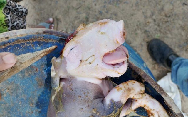 Ainda segundo o produtor, o filhote morreu poucos minutos após o nascimento, enquanto os demais animais da ninhada sobreviveram. “Nunca vi nada parecido aqui, foi algo impressionante”, afirmou.